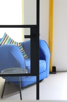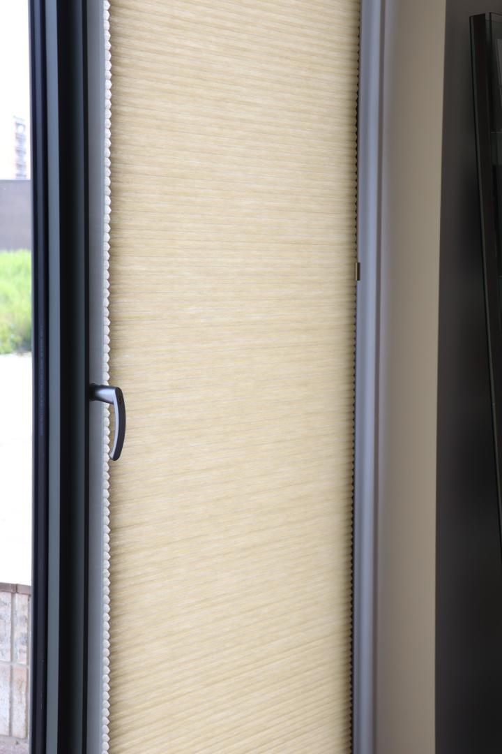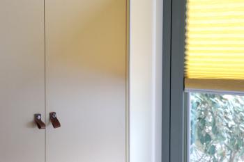 Voor de ramen heeft Richard duettes van Aanhuis opgehangen: De Duettes zijn gemaakt met Lichtdoorlatende stoffen in de kleuren Structuur Geel en Mosterd Geel.