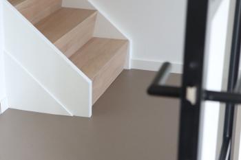 Ook de trap is aangepakt: een strakke “Z-trap” waarbij stootbord en trede naadloos in elkaar overlopen, bekleed in de tint Sky Grey.