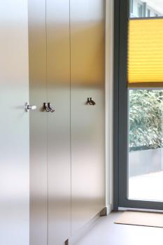 Tot slot zorgde Wiebe voor een slimme opbergoplossing: een draaideurkast op maat in Brushed Gold, afgewerkt met een subtiel leren lusje als greep. Zo blijft het appartement ruimtelijk én georganiseerd.